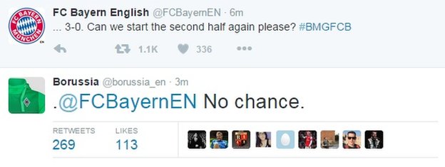 Κάτι που φάνηκε και από το επικό tweet του λογαριασμού των Βαυαρών, λίγο μετά το 3-0 στο 68ο λεπτό. "Μπορούμε παρακαλώ να αρχίσουμε ξανά το δεύτερο ημίχρονο;", ήταν η απίστευτη πρόταση, με την απάντηση της ομάδας του Μένχενγκλάντμπαχ να έρχεται λίγο αργότερα και να τους... προσγειώνει στη σκληρή πραγματικότητα! "No chance" ("με τίποτα" ελληνιστί). Ποίος άλλωστε θα 'θελε κάτι τέτοιο, αν προηγουμένως είχε πραγματοποιήσει τέτοια ματσάρα, έχοντας μάλιστα ένα τόσο μεγάλο όνομα απέναντι;